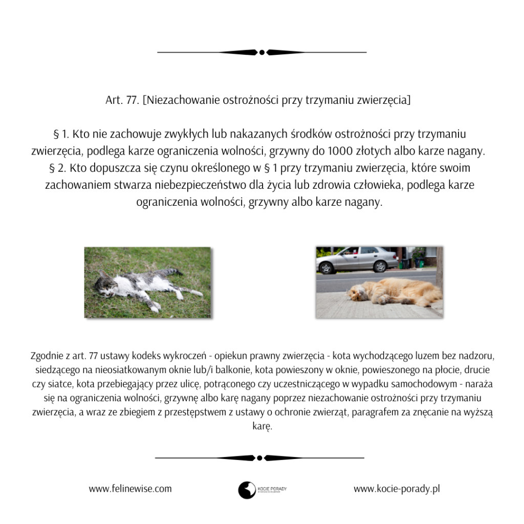 Zgodnie z art. 77 ustawy kodeks wykroczeń – opiekun prawny zwierzęcia – kota wychodzącego luzem bez nadzoru, siedzącego na nieosiatkowanym oknie lub/i balkonie, kota powieszony w oknie, powieszonego na płocie, drucie czy siatce, kota przebiegający przez ulicę, potrąconego czy uczestniczącego w wypadku samochodowym – naraża się na ograniczenia wolności, grzywnę albo karę nagany poprzez niezachowanie ostrożności przy trzymaniu zwierzęcia, a wraz ze zbiegiem z przestępstwem z ustawy o ochronie zwierząt, paragrafem za znęcanie na wyższą karę.